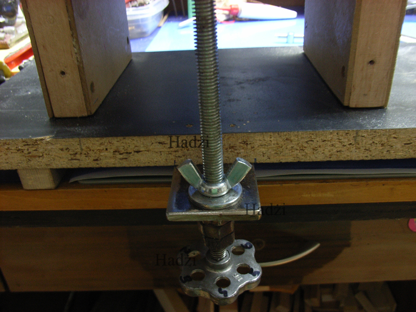 Nareszcie skończyłem budowę szlifierki wałkowej, która jest pierwszym elementem kombajnu (drugim będzie tokarka). Wiele tu na kodze prezentowano już takich szlifierek. Każda jest inna i niepowtarzalna. W mojej nie ma nic szczególnego, no może oprócz stołu. Napęd stanowi stara polska wiertarka. Wał jest ułożyskowany, prawy koniec przystosowany do uchwytu wiertarki. Lewy koniec zakończony jest stożkiem, na którym osadzony jest drugi uchwyt wiertarski (do napędu tokarki). Na wale osadzony jest wałek drewniany o średnicy 10 cm i długości 15cm. W tymże wałku wyfrezowane są dwa rowki. Do mocowania papieru ściernego służą dwa wężyki gumowe. Wałek ścierny przykryty jest pokrywą wykonaną z MDF-u z króćcem ssącym po prawej stronie przedniej ścianki osłony wałka w strefie wypychania pyłu. Pokrywa jest nasadzana z góry i dokręcana śrubkami po dwie z każdej strony. Aby ja zdjąć trzeba poluzować te śrubki i unieść do góry. Stół jest wykonany z płyty stalowej. Od spodu przykręcony jest pręt stalowy służący, jako oś. Z tyłu ścianek bocznych przykręcone są dwie listwy z czterema wspornikami osi stołu na każdej. Ta szlifierka będzie służyła nie tylko do celów modelarskich, więc z tego powodu są te wsporniki do ustawiania stołu w zależności od grubości obrabianego materiału. W najwyższym położeniu osi stołu i opuszczonej płycie max do dołu można szlifować materiał grubości 25 mm. Podnoszenie płyty stanowi śruba M 10 z pokrętłem w prowadnicy zespawanych trzech nakrętek od spodu uchwytu. Od góry na śrubę nałożona jest szeroka podkładka i nakręcona nakrętka motylkowa do kontrowania położenia śruby. Ze względu na możliwość zmiany wysokości osi nie ma i nie będzie listwy z podziałką milimetrową ( musiałoby ich być cztery, po jednej do każdego położenia osi. Jeden pełny obrót śruby powoduje zeszlifowanie 0,5 mm obrabianego materiału. Do testowania na wałek założyłem papier ścierny na płótnie (polski). Docelowo założony będzie papier żółty lub biały firmy szwedzkiej. Ten papier nie zakleja się i tak szybko nie wyciera. Po strzepnięciu pyłu wygląda prawie jak nowy. Jest droższy niż nasz, ale coś za coś. Samo wykonanie i użyte materiały nie są eleganckie, bo maszyna ma spełniać dokładnie swoje zadanie, a nie ma ładnie wyglądać. Poniższe zdjęcia przedstawiają jej szczegóły.