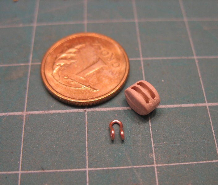 A teraz na serio i bez pieprzenia w bambus. Kuter został cały zaolejowany i sobie schnie. A ja robię szekle. Póki co zrobiłem ich sztuk trzy, notabene opracowanie techniki zajęło więcej czasu niż sama robota. Zapewne będę je malował na czarno, bo patyna cyny może nie chwycić, a nawet jak chwyci to może się potem pościerać. Tak więc szekle w liczbie trzy wyglądają tak jak na zdjęciach, w towarzystwie 4 mm bloczka z którymi to bloczkami będą współpracować. Zdjęcia półproduktu pokazuję tylko dlatego, że chciałbym się dowiedzieć opinii kolegów - czy taka wielkość może być czy kombinować i robić mniejsze (nie wiem czy uda mi się, ale że "da się" to wiem) Jeżeli wszystko będzie ok i towar zostanie zaaprobowany pokażę fotka po fotce, krok po kroku jak uzyskać gotowy produkt.