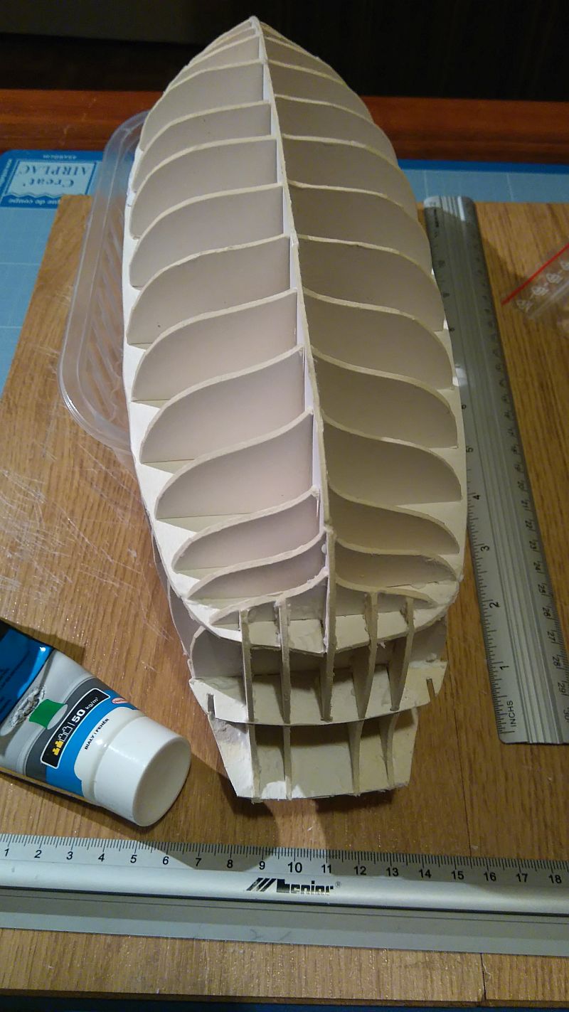 Przychylam się też do zdania Irka w kwestii cięcia szkieletu. Oczywiście wymaga to wprawy, zwłaszcza cięcie grubej i twardej tektury, ale dobrze jest robić to dokładnie, bo choć szkieletu w ostatecznym rozrachunku nie widać, to jego jakość rzutuje na późniejszy wygląd kadłuba.