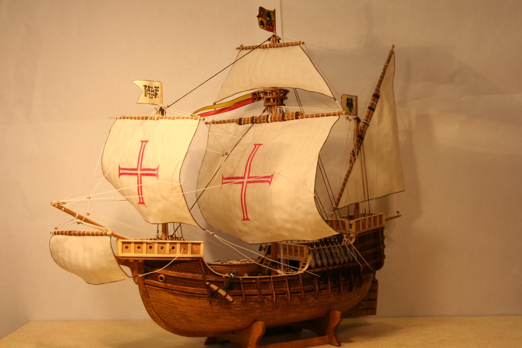 Dołączając do społeczności na Kodze byłem w trakcie sklejania kartonowej Santa Marii z wycinanki którą kupiłem jeszcze w czasach PRL w kiosku Ruchu. Nawet to nie MM, bez podanej skali - szacuję że to ok 1:100 lub blisko. Sprostujcie jeśli się mylę- sam kadłub ma ok 28 a całość ok 39 cm. Obserwując wiele ciekawych relacji i technik budowy, postanowiłem co się dało wzbogacić fornirem i drewnem. Na zdjęciach to co udało mi się zbudować. Osobiście jestem bardzo zadowolony z efektu - pierwsze fornirowe poszycie dna( choć na burty już było za późno ) pokład i wszystkie części wykonane samodzielnie włącznie z bloczkami i jufersami. Sam dostrzegam już kilka błędów które popełniłem, ale na razie są chęci do pracy i zamiar wstawienia do stoczni kolejnej łajby. Z góry dziękuję wszystkim którzy dzielą się doświadczeniem co i jak można wykonać. Konstruktywna krytyka mile widziana