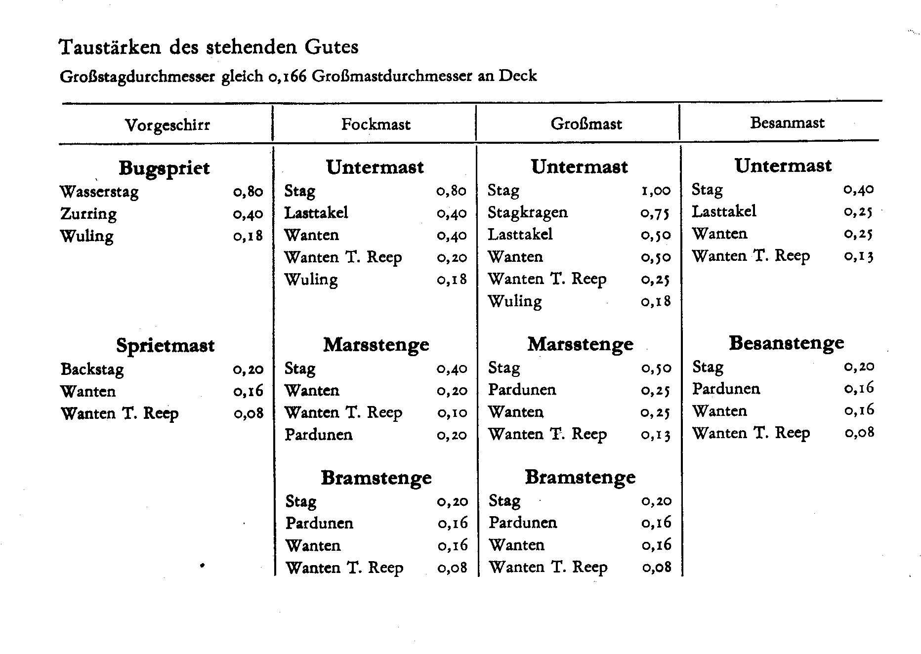 Adam co prawda podał programik do obliczeń lin takielunku stałego ale podam tabelkę dla okrętów 16 i 17 wiek którą sam się posługuję.Jako wymiar bazowy jest 0,166 średnicy podstawy grotmasztu przy pokładzie i to jest 1.Od tego obliczamy pozostałe wymiary.Na podstawie książki" Okręty wojenne 16 i 17W".Może kolegom się przydać.R