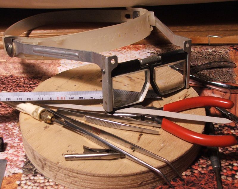 A teraz pora na wyblinki.Coś co uspokoi skołatane nerwy.Sama przyjemność.Tfu..tfu..jak by mi ktoś tak powiedział to....bym nie uwierzył.Po jakimś czasie wanty luzują się.Tak że trzeba to przewidzieć i dociągnąć na jufersie.Ja tego nie przewidziałem, zapomniałem i nie zostawiłem nadmiaru tak że wanty zwłaszcza skrajne są niezbyt napięte.To z kolei rzutuje na napięcie wyblinek i problemy z wiązaniem.Do skrajnych want wiązane jednym supełkiem a nadmiar ~2mm odkładany do wewnątrz.Wiązania utrwalane odrobiną rzadkiego kleju introligatorskiego tak ze w razie czego można skorygować.Wanty wykonywano z linek ~12mm i wiązano co ~40cm.Do prac posługuję się szkłami przybliżającymi Preksera.Nakładanymi na okulary do czytania.Dla Andrzeja .Może gdzieś na giełdach można je znaleźć R.