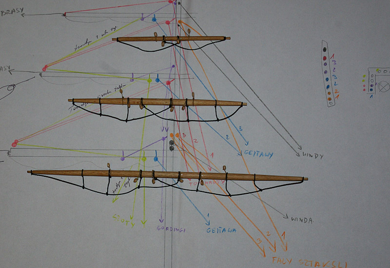 Jako, że do mojej golety nie miałem praktycznie żadnych planów olinowania, (nie licząc schematycznych paru linijek symbolizujących liny przy rysunku ożaglowania)) no to se główkowałem, sprawdzałem, gromadziłem literaturę (tu podziękowania dla Kolegów z forum), zbierałem i analizowałem zdjęcia, rozrysowywałem sobie różne układy linek, aż w końcu zdecydowałem, jak toto powinno wyglądać. A że trwało to półtora roku.... no cóż.. modelarstwo to nie Wyścig Pokoju.