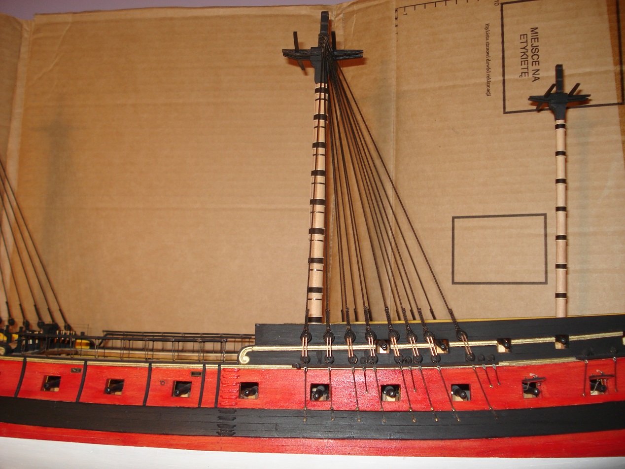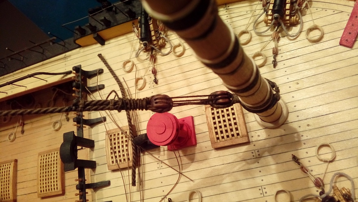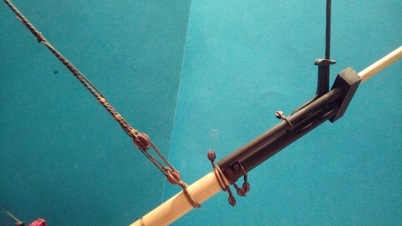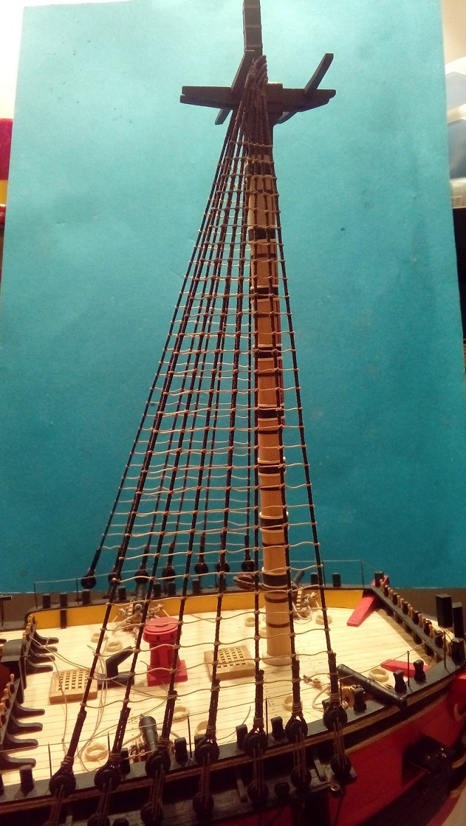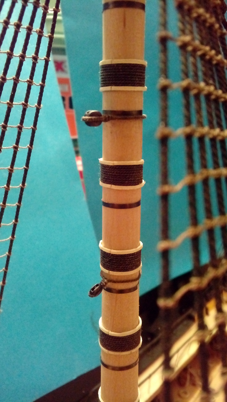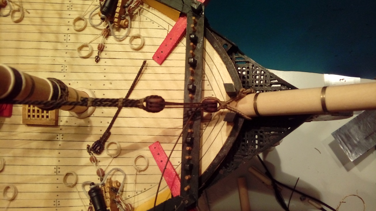 Witam ciąg dalszy olinowania wyblinki pierwszego piętra zawiązane. Grotsztag zamontowany wstępnie jeszcze tylko barwienie gałki tureckiej i można na stałe wiązać. Reszta na zdjęciach