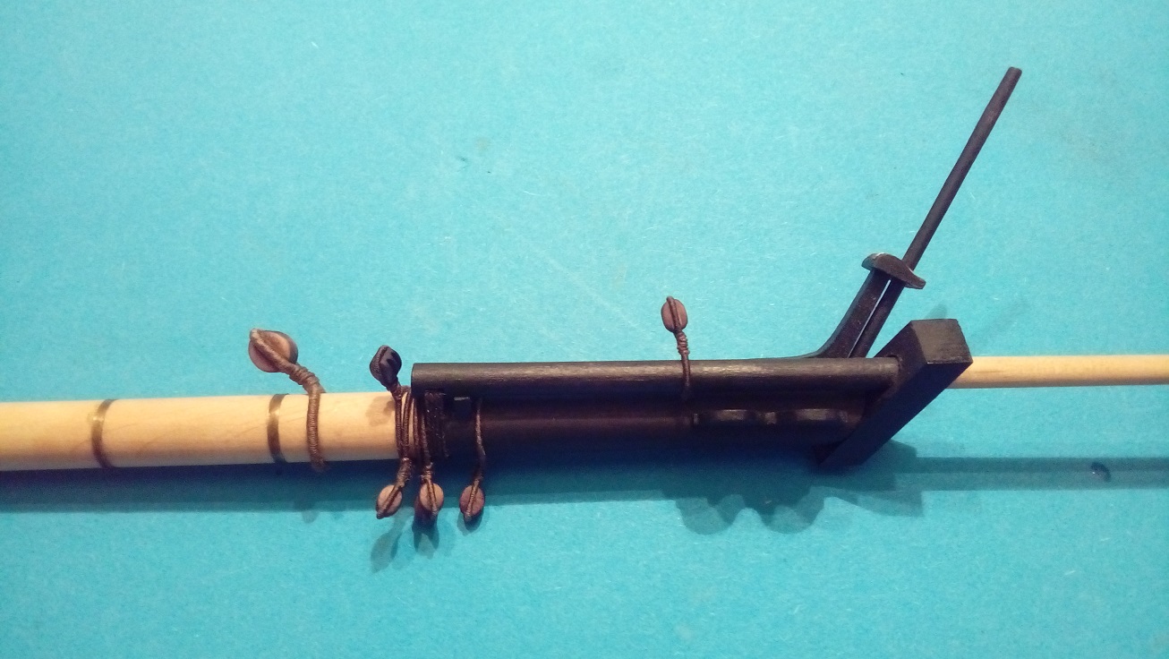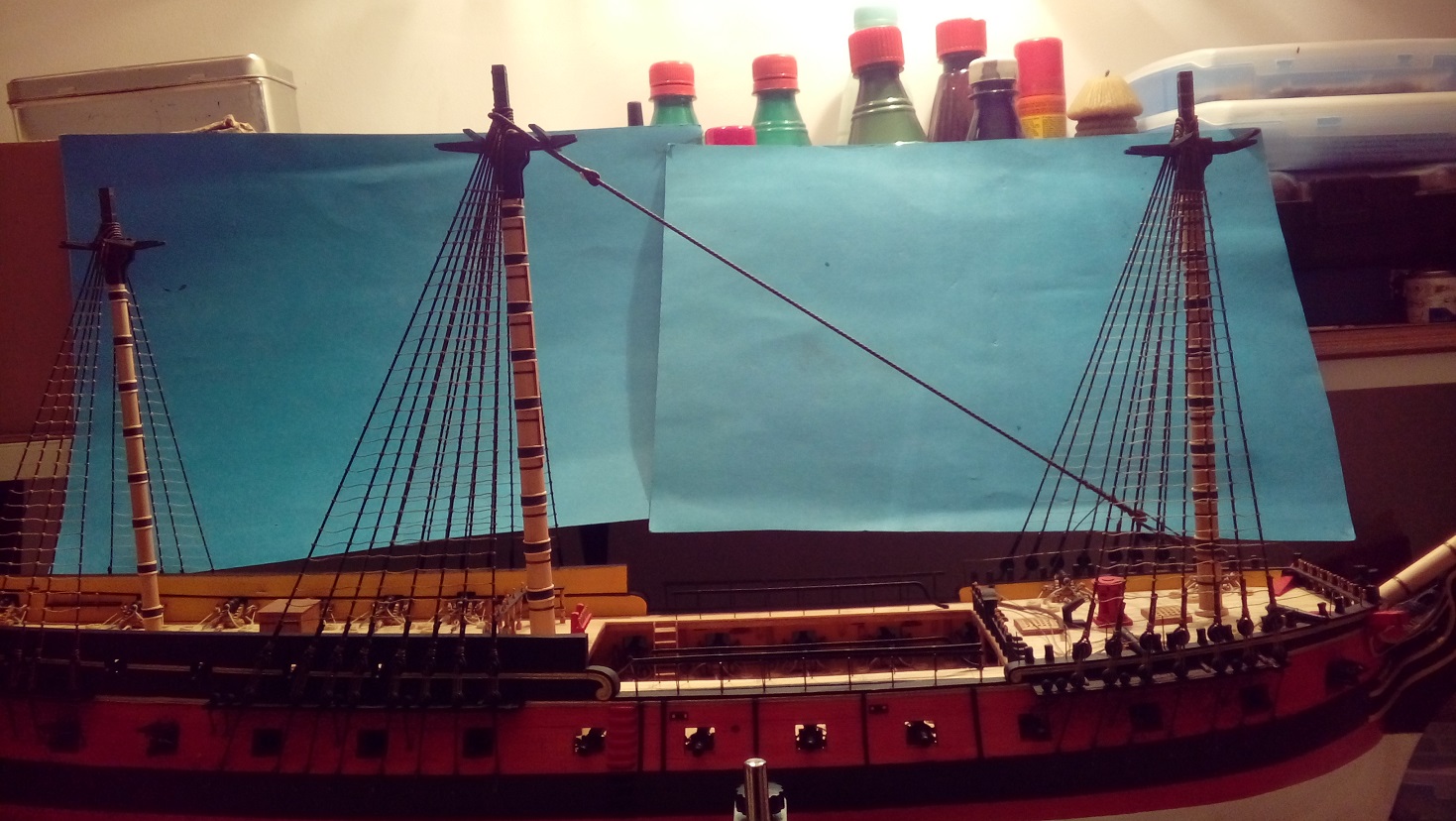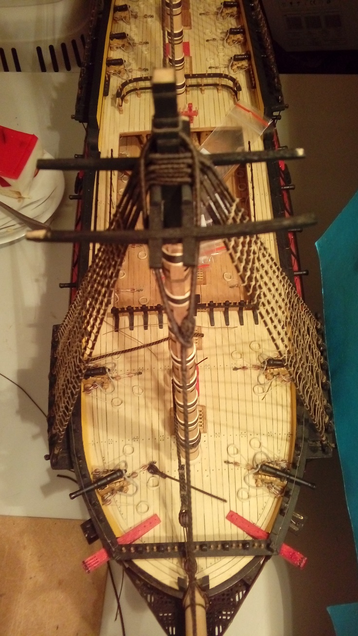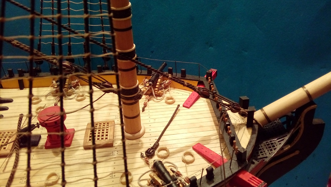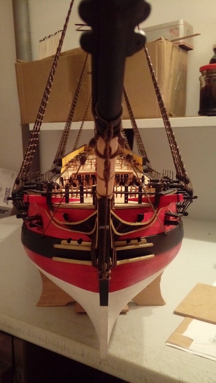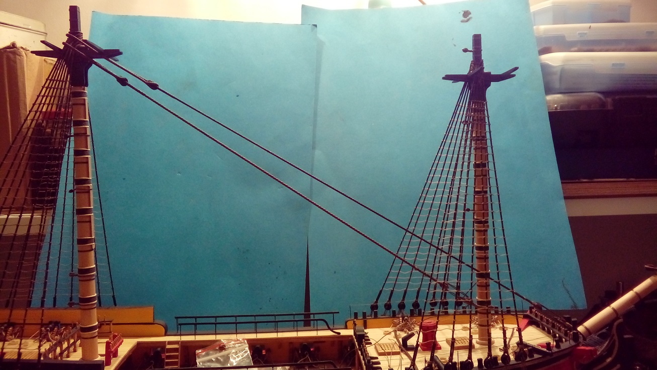 Witam ciąg dalszy olinowania wyblinki pierwszego piętra zawiązane. Grotsztag zamontowany wstępnie jeszcze tylko barwienie gałki tureckiej i można na stałe wiązać. Reszta na zdjęciach