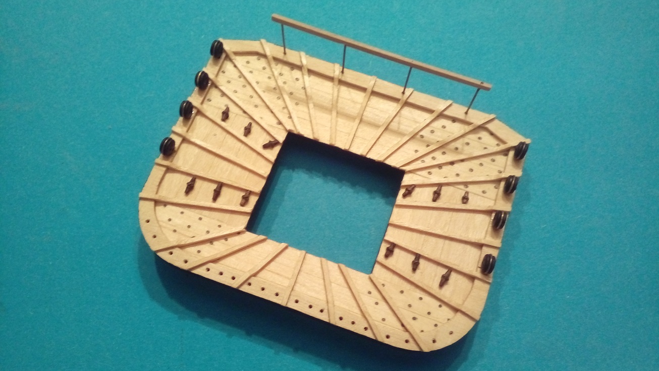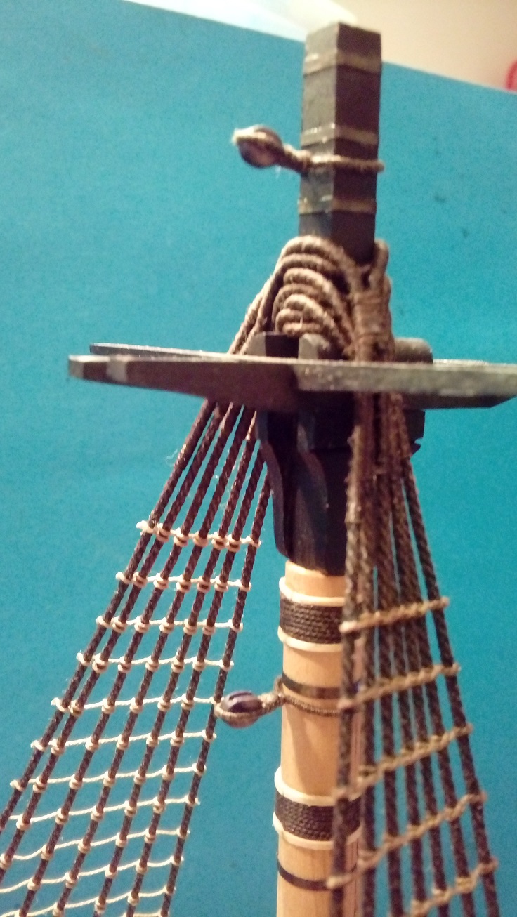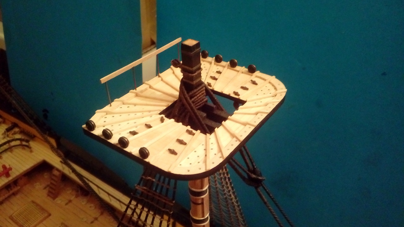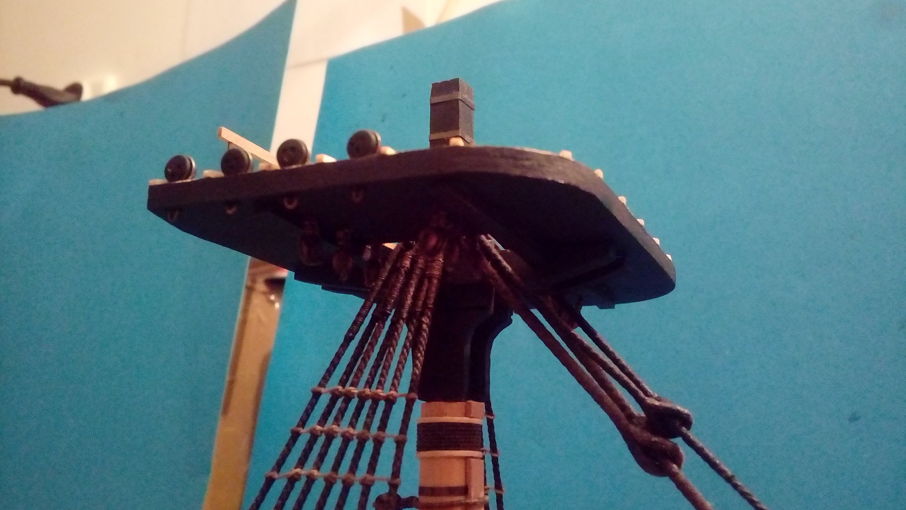 C.D. tym razem doszło kilka lin przy bukszprycie. Pora piąć się w górę więc dokończyłem platformy marsów a raczej uzbroiłem je w bloczki i poręcze oraz zamontowałem na miejscach docelowych. Teraz kolej na stengi i bramstengi