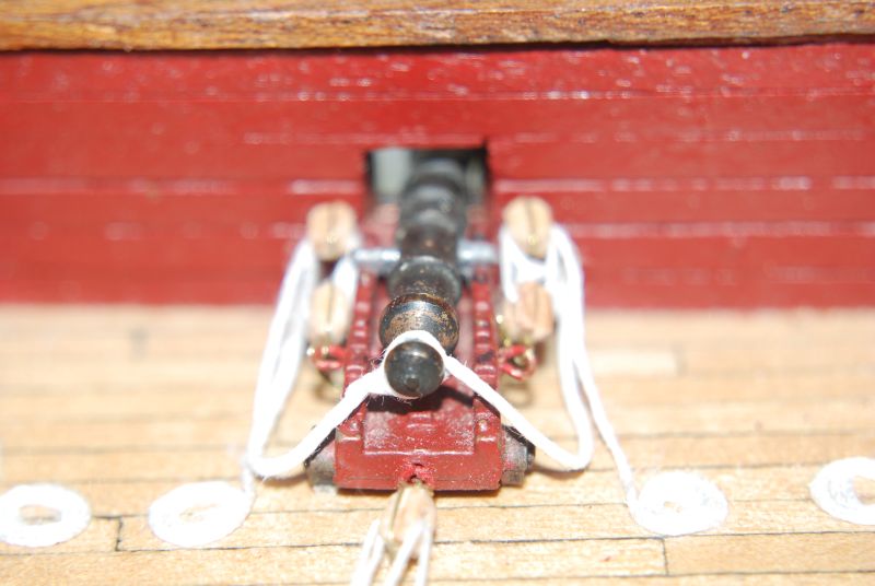 Żeby nie było, że nic nie robię. Przeskoczyłem w końcu to co mnie zablokowało - temat armat. Wiem że linki za jasne ( przykurzą się kiedyś ) ale jak już się tyle przy tym na grzebałem to je wyeksponowałem. Bloki może ciut za duże. Wyszły 2,5 mm. Talie do podciągania trochę uproszczone ( pojedyncze bloki z podwójnym przeplotem) Ale całościowo dla mnie przynajmniej akceptowalne. Zacząłem jakiś czas temu myśleć ( zdarza mi się ) o kołkownicach. CO co zaproponowało Occre to jest tragedia. Każdy kolek patrzy w inna stronę mimo dobrze wywierconych otworów.Dolna ich część jest stożkowa. Za to kołeczki RB MODEL rewelacja. Do zrobienia rozstawu otworów użyłem cyrkla ze śrubką do nakłuwania z dwoma igłami.Pochwalę się że jedzie do mnie Wasa Corela :-) Wyszarpana za śrubki. Na szkielecie naklejone kilka listewek 1 poszycia.