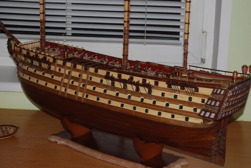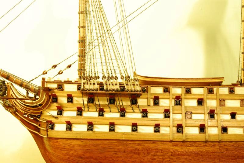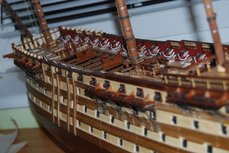 Podsumowanie działu. OCCRE dało bandery nieformowalne, przy próbie nasączenia jakimkolwiek utrwalaczem typu lakier do włosów bądź już zwykłe namoczenie poprzez przesiąknięcie kleju, farba zostaje na palcach a na samej banderze zostają zgrabnie zdjęte linie papilarne, banderę zatem odmalowywałem po godzinnej walce z formowaniem - efekt średni ale ujdzie w tłumie, lepiej było zrobić własną od podstaw bo ten czerwony koło czerwonego nie leży.Jest to pomarańczowy - róż. Małych jufersów zabrakło 6 sztuk dwie zgubiłem więc razem osiem, a dużych zostało z 10 czort wie po co + jeden pęknięty, dodając jeden nadprogramowy żagiel który nie wiem gdzie miąłbym założyć wychodzi na to że niespecjalnie OCCRE się przykłąda, o braku podstawki która kupiłem na Allegro od zesstawu DA nie wspomnę. Choć mają maszynę do cięcia wodą i tu duży plus .Bloczków też będzie za mało jeśli wykonujemy model zgodnie z planami a nie dokumentacją Occre. Ja się posiłkowałem tymi co zostały mi z innych budów no i dorabiałem wlasne. Część rzeczy w ogóle nie została uwzględniona. Coś tam niby jest narysowane ale nic nie widać co i jak a wytłumaczenia tez nie ma. Furty armatnie poza krytyką , niedolane klapy powyszczerbiane 10 w ogóle się nie nadawało do założenia bo były szczątkowe ( OCCRE ambzury dało co do sztuki - czyli ktoś to liczył i miał w rękach, bo jak były niedolane to na wadzę powinno być jedno lub dwa więcej) Klap za to zostało 10, zrobiłem wielki błąd że nie opracowałem otworów jak należy - boli mnie to sromotnie. Starałem się tak zrobić żeby nie rzucało się te metalowe badziewie w oczy . Dokupiłem paczkę furt AMATI, zupełnie inna bajka , choć też blachówa. Są błędy w podwójnych a pojedynczych bloczkach w dokumentacji. Linki 0,5 jest na styk. 0,8 zostaje szpulka - prawie 2 . Za to zostało mi 2 metry łańcucha który miał być podwięziami. Podsumowując wiele czasu się traci na dojście co i jak na równi z własnym wykonywaniem z planów albo i jeszcze więcej. Ogólnie z efektu jestem zadowolony. Ten zestaw można określić mianem sterty klapek z której " coś " można zrobić. Myszor myli się że to tylko postykać. Większość trza przerabiać i dorabiać.