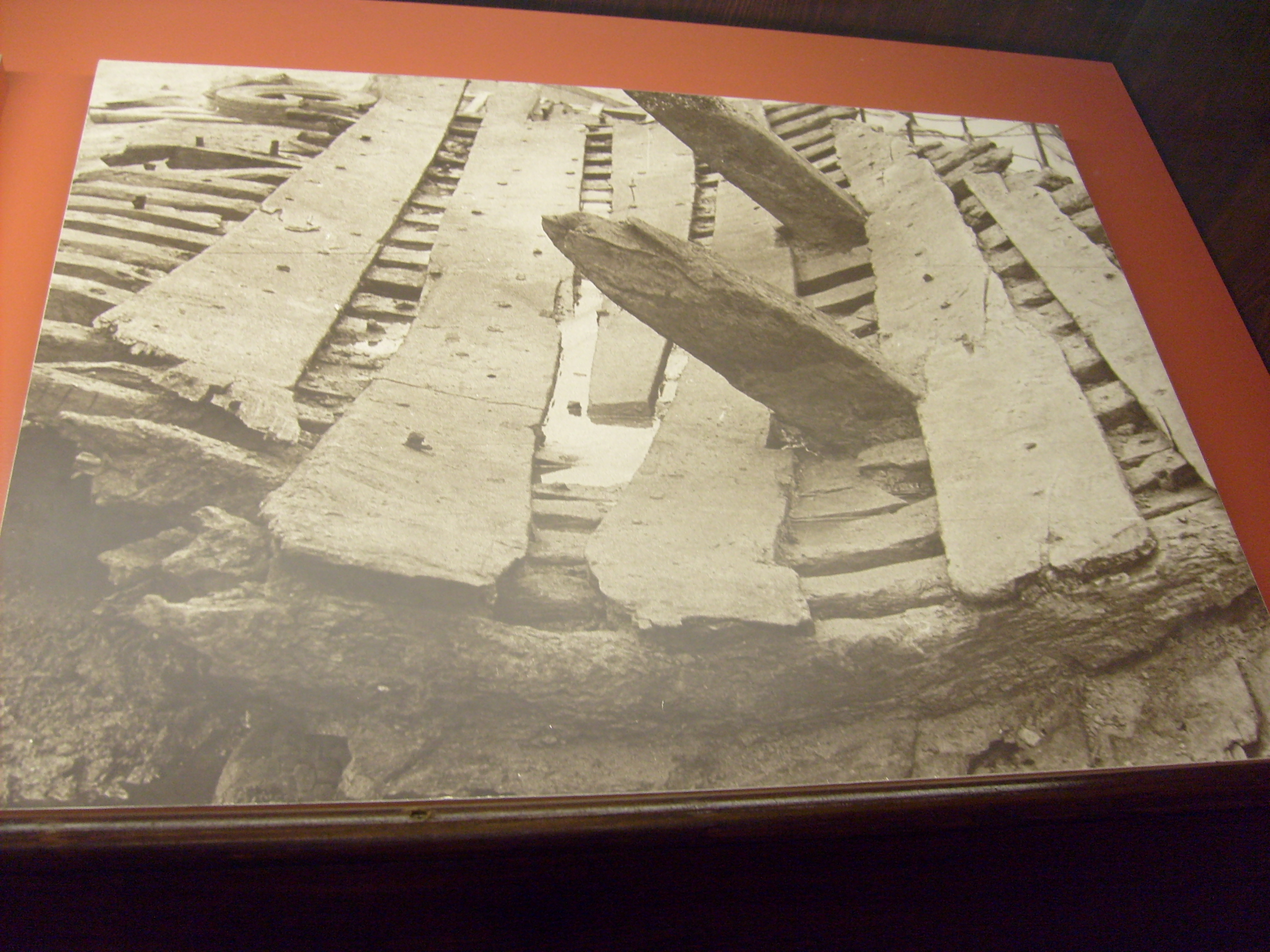 Okazuje się, że te ciemniej pobejcowane fragmenty to ta część wraku, która została wydobyta. Reszta to rekonstrukcja.