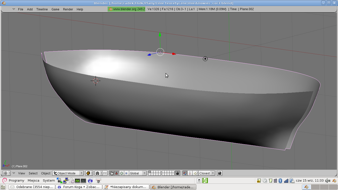 Udało mi się poprawnie pociąć kadłub holka, dzięki czemu udało mi się wyznaczyć przekroje kadłuba, tak to mniej więcej wygląda: