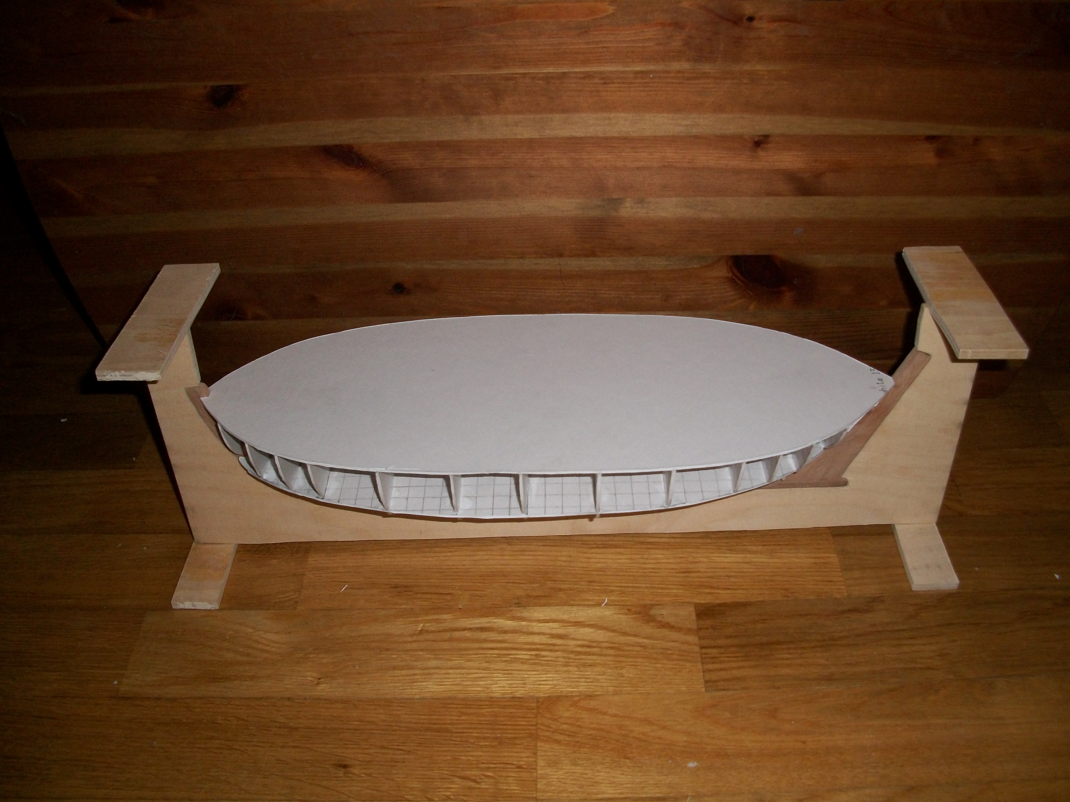 po zamocowaniu całości w stoliku montażowym wykonam papierowe szablony planek na jednej burcie. Gdy już będę miał gotowe, zacznę na ich podstawie poszywać statek.