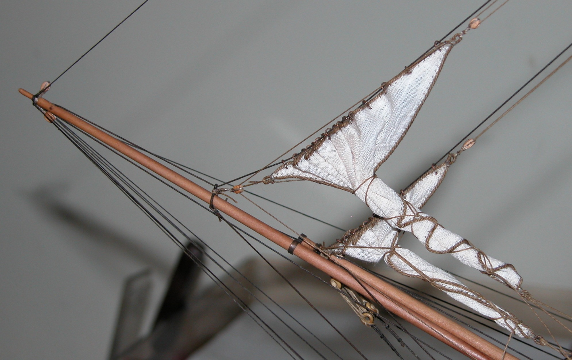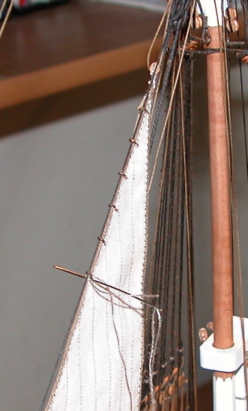 I można było przejść do stawiania żagli. Na początek zmarlowane: sztafok, bomkliwer i latacz. Zapomniałem wspomnieć o tym wcześniej, ale zgodnie z radą Adama i wskazówkami w literaturze, żagle zaplanowane jako zmarlowane, przygotowane zostały mniejsze (okrojone) w stosunku do właściwych wymiarów (aby uniknąć nadmiernych „brzuchów” po zmarlowaniu). Niestety nie mogłem zastosować metody opisanej przez Adama (polegającej na wcześniejszym przygotowaniu „kokonów”, czyli zmarlowanych sztaksli i powieszeniu ich na gotowo). Musiałem wszystko, krok po kroku, robić na modelu.