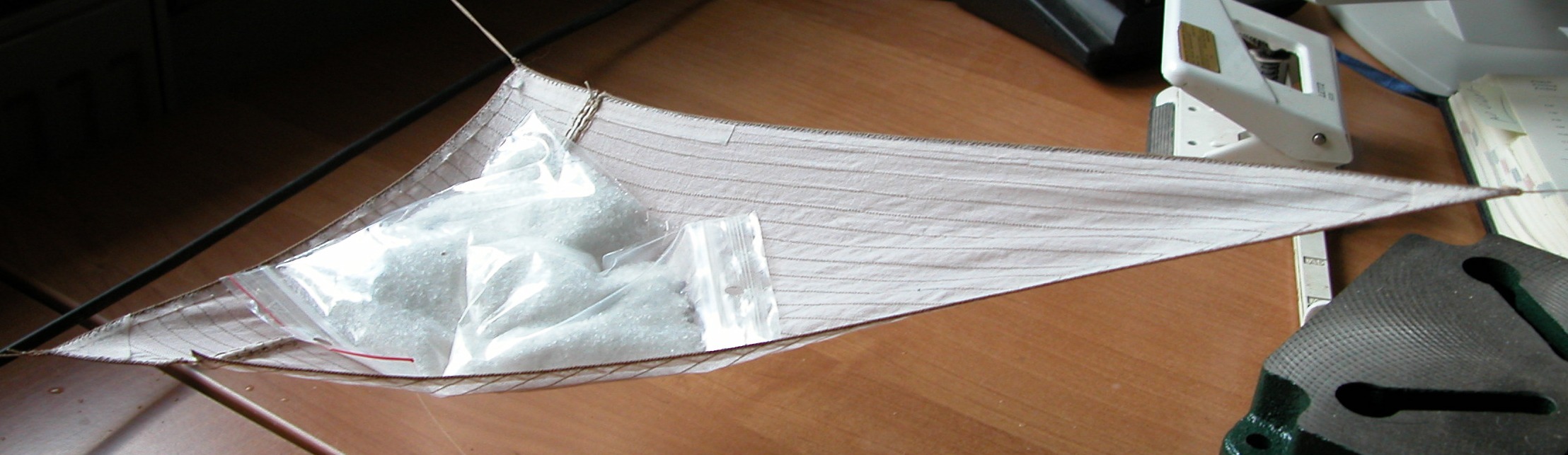 Na początek uformowałem „brzuszek”. Choć jest powszechnie wiadomym, że do formowania brzucha najlepiej nadaje się piwo, zastosowałem woreczki z solą – uwiązany za wszystkie rogi żagiel lekko zwilżyłem i obciążyłem woreczkami.