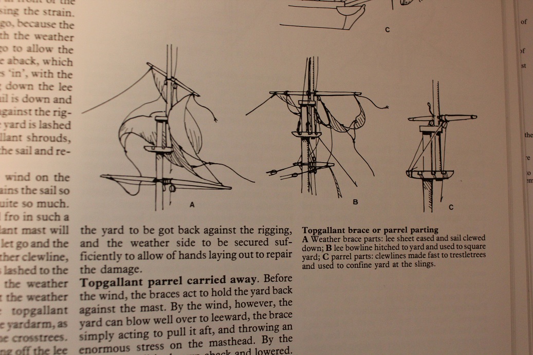 Też nigdzie nie znalazłem żadnej informacji co się działo z linami bocznych żagli po schowaniu wytyków.Być może pozostawały główne liny które mocowano do bloków na masztach.Wytyk zanim został wsunięty w swoje gniazdo musiał być pozbawiony wszelkich bloków i lin.Zobacz może ten schemat coś Ci pomoże.Trudna sprawa.Jakąś decyzję musisz podjąć i na tym polega zabawa.R