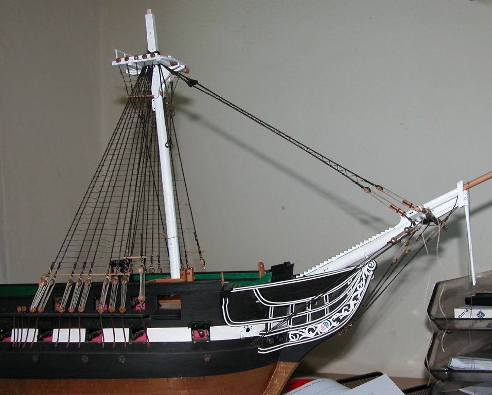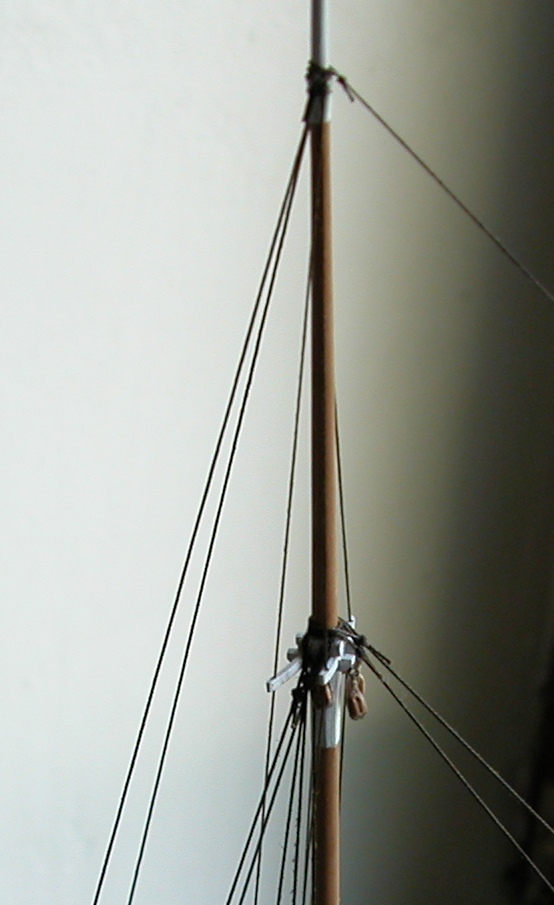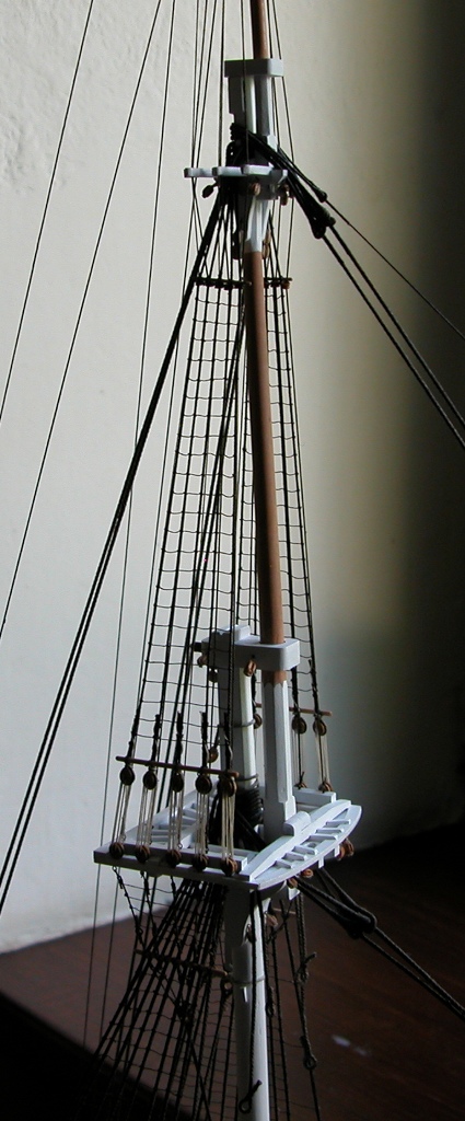 Przy okazji obnażyło niestety mój błąd - górna powierzchnia platformy marsa winna być szara !!!. Ze wstydem i skruchą przyznaję, że nie dopatrzyłem się tego na planach (a jest taka notatka, tyle że drobnym drukiem). Najgorsze jest to, że przy zamontowanych stenwantach i bramstenwantach nie ma praktycznie możliwości (dostępu) aby to przemalować. A strasznie mi się nie chce tego wszystkiego demontować. Muszę się przespać z tym problemem.