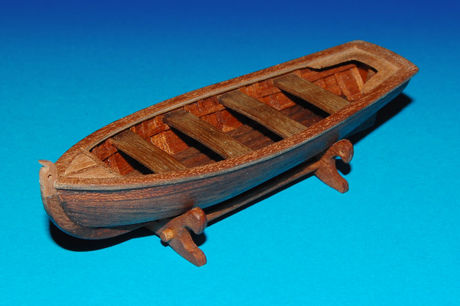 Budowałem ją bez kopyta i bez ożebrowania (być może zastosowałem dwie wręgi do podpory), po prostu do stępki z pawężą doklejałem planki, następnie listewki wewnątrz, tworząc drugie poszycie, później greting, ławeczki i zakończenie burt (parapet)