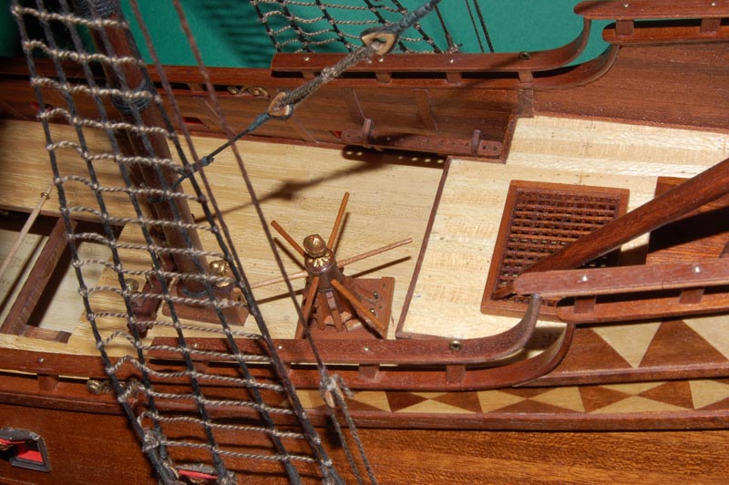Po wklejeniu parapetu przyszła kolej na słupki relingu (analogicznie jak wcześniejsze słupki galionu) z mahoniowego krawędziaka 4 x 4 mm. Pewną trudność sprawiało przycięcie do właściwego kąta, a później wklejenie pomiędzy listwy