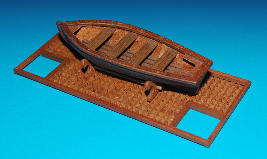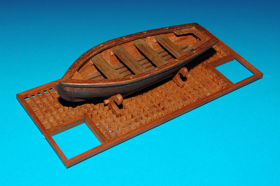 Typowo, umocowywano lodzie okretowe przywiazujac je na rusztowaniu zbudowanym tymczasowo z okretowych tzw. "spars" - drzewcow, glownie zapasowych rei, bomow czy gafow. Albo tez, jesli juz na podobnych jak Twe wspornikach, to poszerzano je tak, by ich "nogi" obejmowaly z zewnatrz greting tam sie znajdujacy i opieraly sie o deski pokladu raczej, albo nawet o reling od burty, a sama lodz byla podwieszana wyzej ponad gretingiem, ktory sam w sobie mial byc w zamierzeniach konstrukcja latwo demontowana w razie koniecznosci.