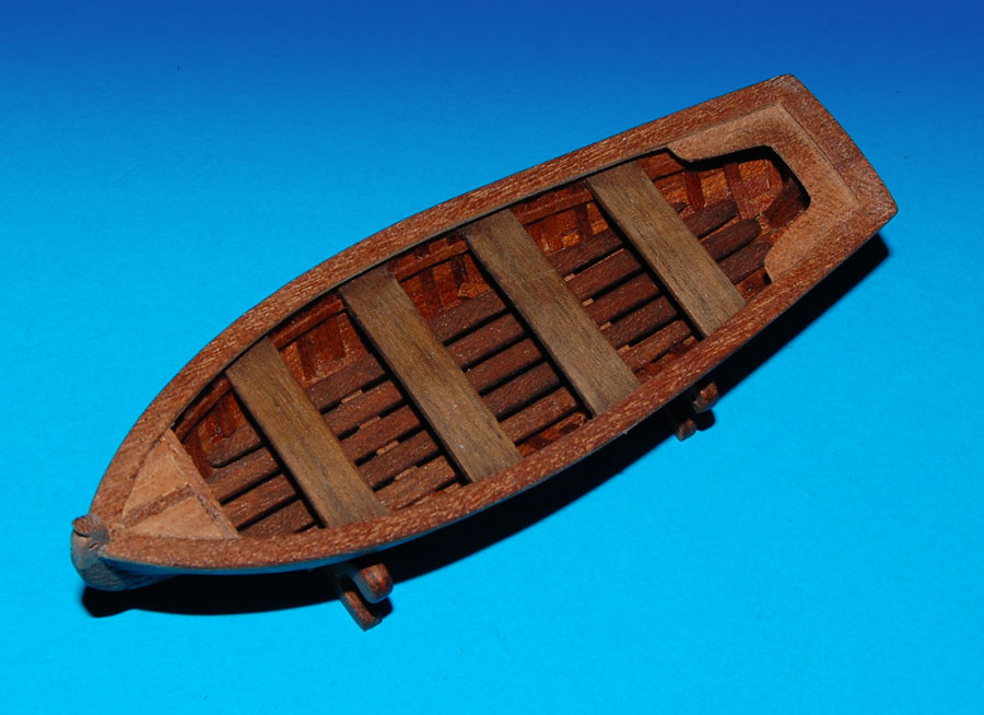 Budowałem ją bez kopyta i bez ożebrowania (być może zastosowałem dwie wręgi do podpory), po prostu do stępki z pawężą doklejałem planki, następnie listewki wewnątrz, tworząc drugie poszycie, później greting, ławeczki i zakończenie burt (parapet)