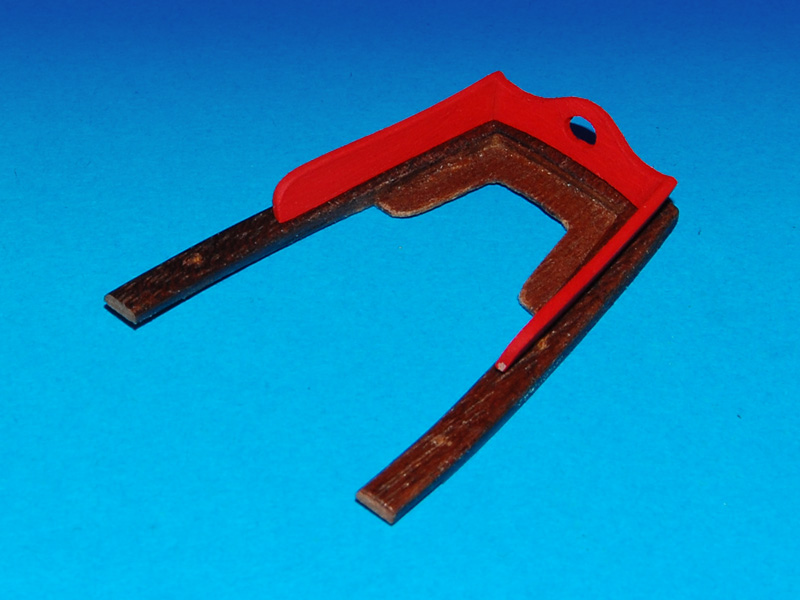 Listewki z forniru brzozy, na burcie 3 mm, na pawęży ok. 4,5 mm w najszerszym miejscu. Pomalowałem matowym akrylem (Renesans 08 cynober), następnie brązą (w proszku z medium malarskim) namalowałem ornamenty - podcienie kolorem brązowym (brązowy akryl mi się skończył więc zrobiłem mix cynobru z czarną - obie farby matowe).