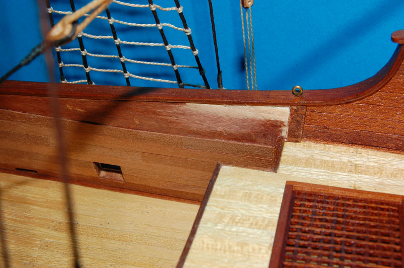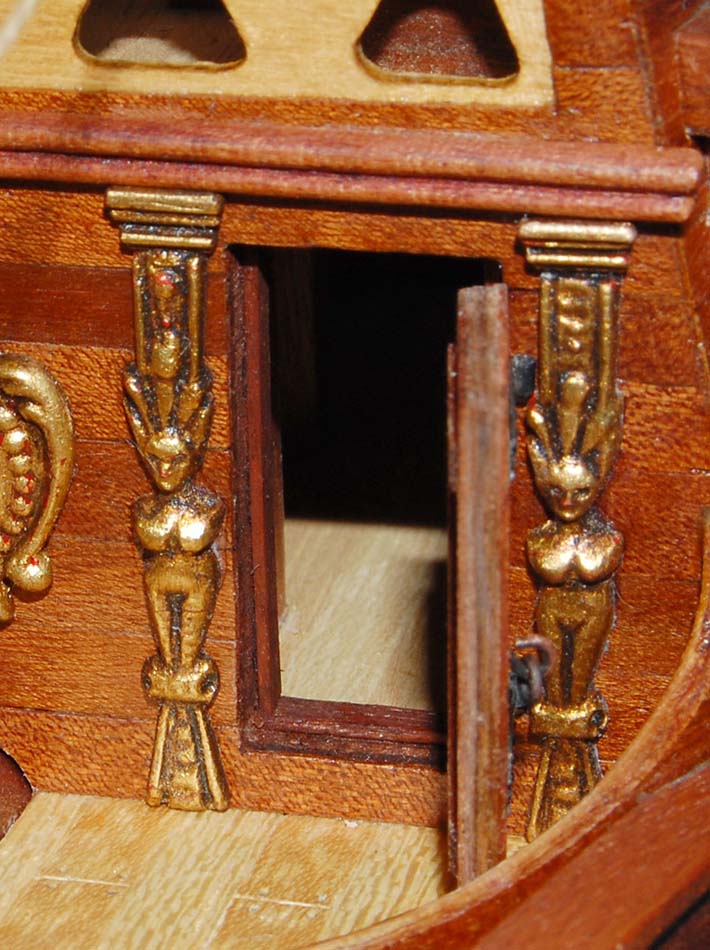 Wywierciłem otwory na dolne zawiasy nieco pod kątem (tak jak burty kosza dziobowego pozwalały) i zamontowałem drzwi. Odkleiłem listwę nad drzwiami, następnie wkleiłem nową (profilowaną) listwę, pilastry i herb.