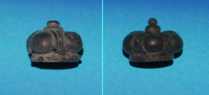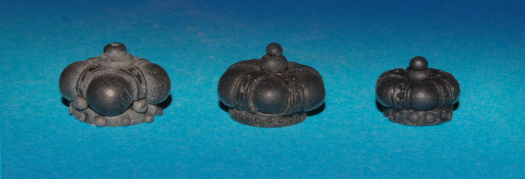 Koronę ulepiłem z modeliny - bardzo prosty sposób. Podstawa 1 mm placuszek, fi 13 mm, na to 4 kulki i krzyż jako 4 kabłąki i dwie mniejsze kulki na zwieńczenie (ta z lewej, szer. 15 - 17 mm).