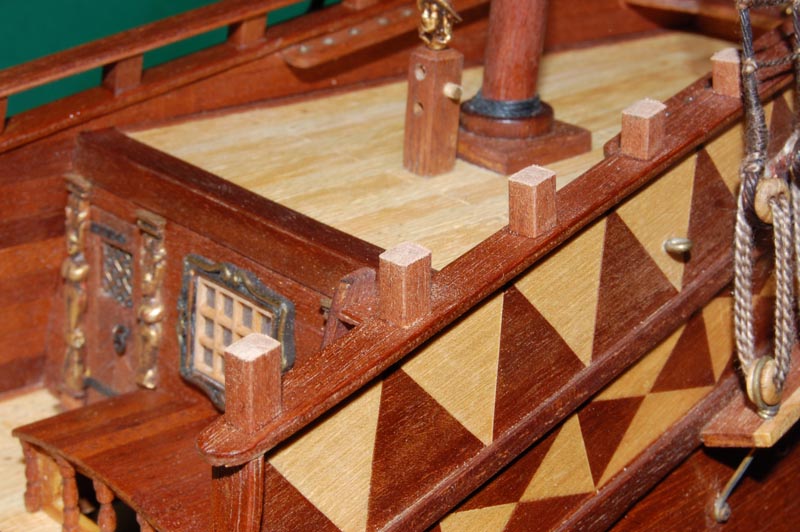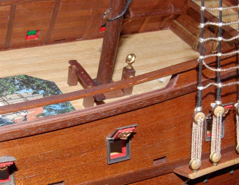 Po wklejeniu parapetu przyszła kolej na słupki relingu (analogicznie jak wcześniejsze słupki galionu) z mahoniowego krawędziaka 4 x 4 mm. Pewną trudność sprawiało przycięcie do właściwego kąta, a później wklejenie pomiędzy listwy