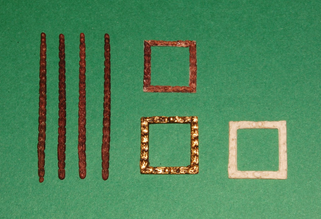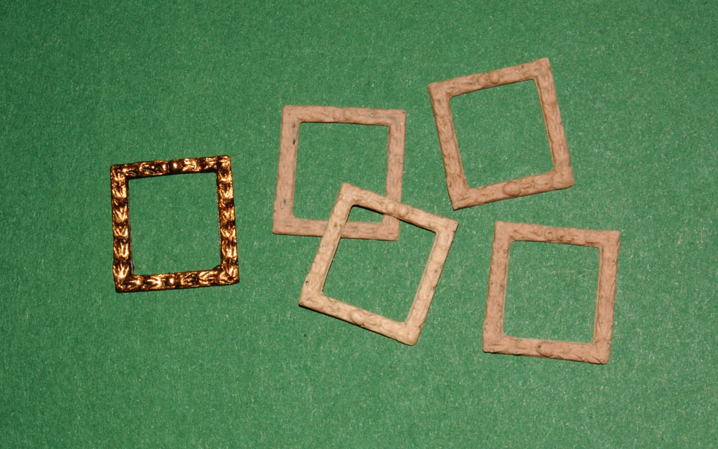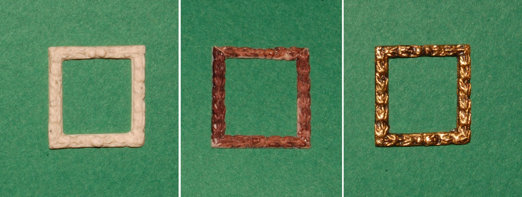 Na zdjęciach poniżej "prawidłowa" kolejność działania: ramka (odlew z Distalu), podkład (tu bajca nitro - wielokrotnie pisałem w relacji, że trwale barwi Distal zmieszany z pyłem drzewnym) i pozłota (patynowana).