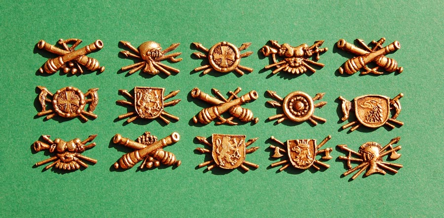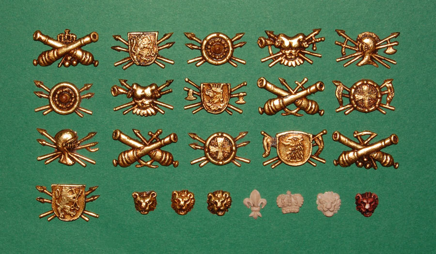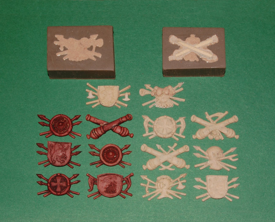 Pierwsze ozdoby - jak widać kolejne formy dział modyfikowałem dodając elementy broni, korony, kule dział, jak również pod tarcze, hełmy i zbroje (tego nie widać, ale we wszystkie drobne detale odstające jak "piki i strzały" zatapiam szpilki dla wzmocnienia).