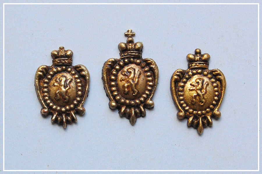 Natomiast flagi czy obuchy toporków to "wydłubałem" różnymi narządkami w plastelinowej formie i tak też robiłem pozostałe "panoplia", rzeźbiąc w negatywie zbroje, hełmy, bębny, trąbki, korony czy małe lwy (i wspomniany na wstępie herb). Niestety nie mam tutorialu wykonu i trudno by było takowy obecnie zrobić, bo detale te wykonywałem w lutym 2015 roku, ale mam tutorial (hucznie powiedziane