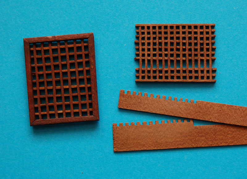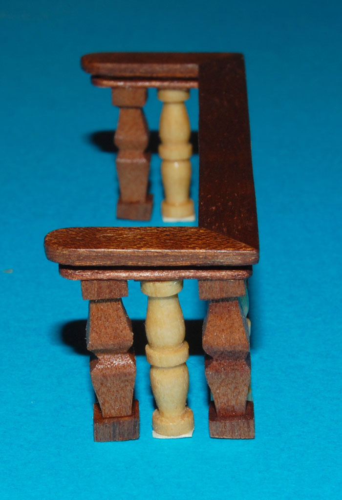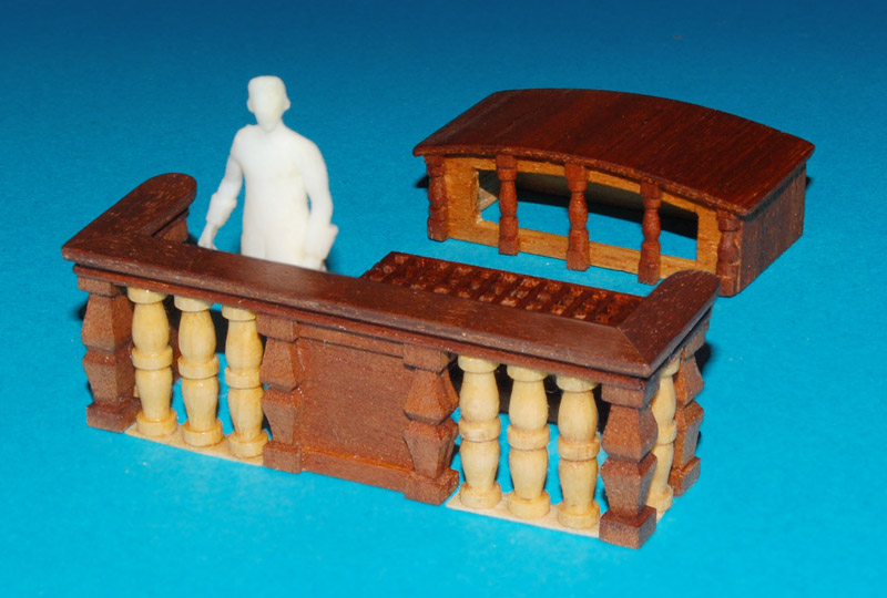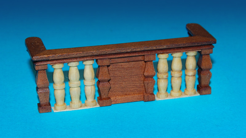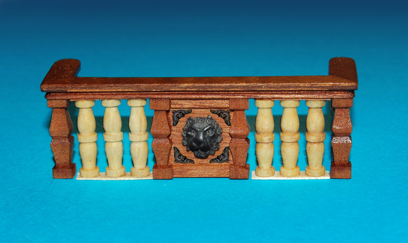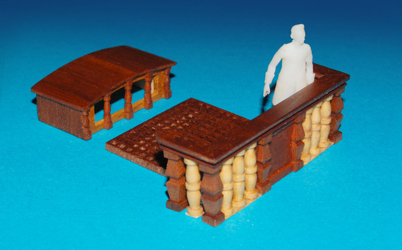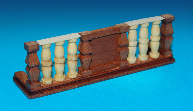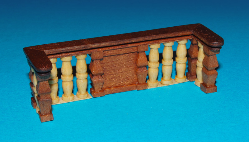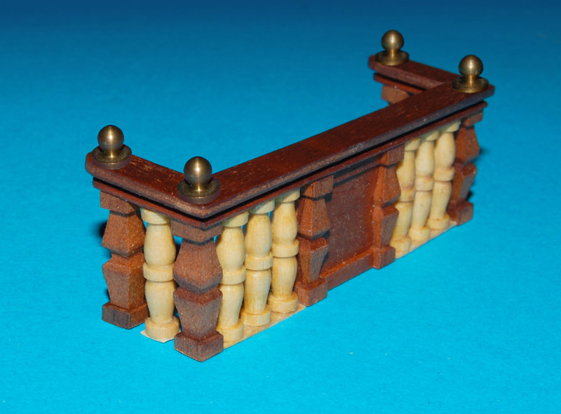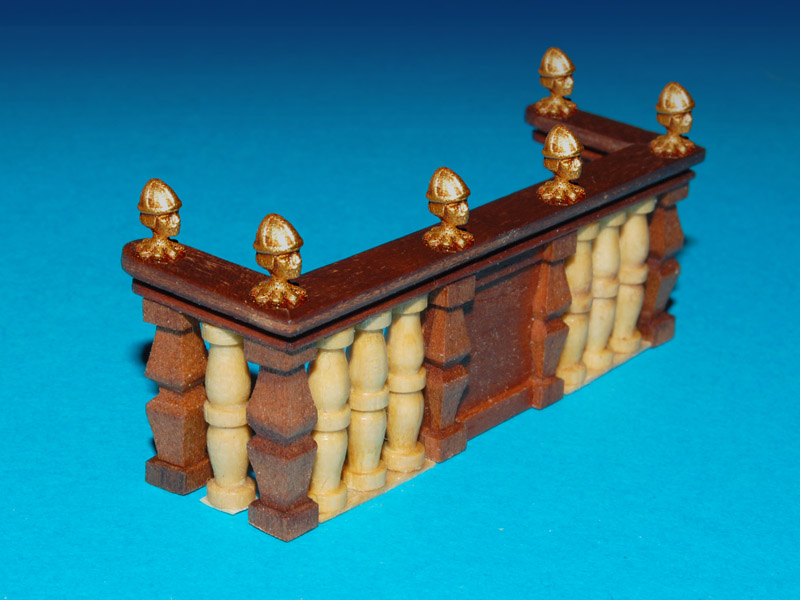 Barierkę, robię z tych samych elementów i analogicznie jak barierkę galerii (tzn. mahoniowe tralki i płycina). Również pod kątem, uwzględniając wznios pokładu (w kolekcji była prostopadle). Poręcz to już nie prosta listwa tylko profilowana.