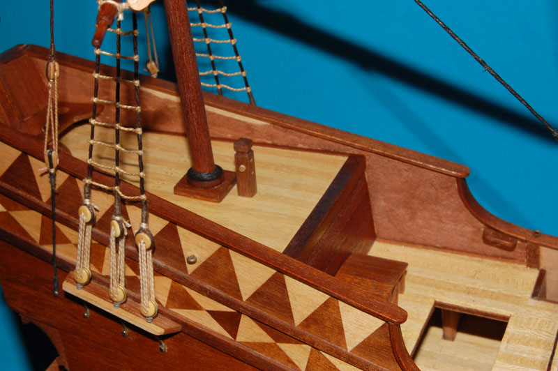 Pisałem, że nie miałem materiału (mahoniu) na oklejanie burt, widać to niestety na ścianie grodzi - tu użyłem bejcowanych listewek raminu (nawet brzozy nie miałem :evil:, a modelować się chciało :lol: ) - niestety kolor przybrał odcień inny od zamierzonego :twisted: .