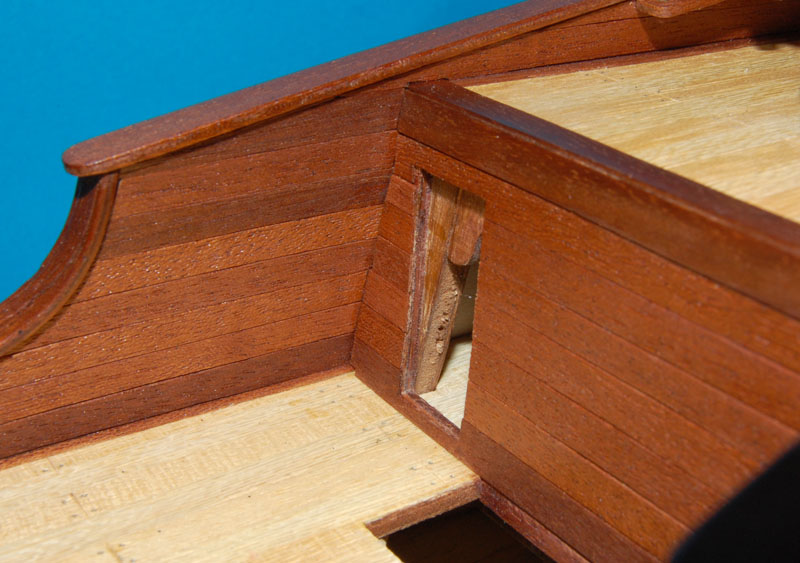Burty na rufie od wewnątrz zabejcowałem, teraz przynajmniej wiem czemu nie bejcowałem ich wcześniej. Początkowo na burtach pozostawiłem kołkownice, ale i je usunąłem - łatwiej usunąć i wkleić ponownie, niż męczyć się z dopasowywaniem listew.