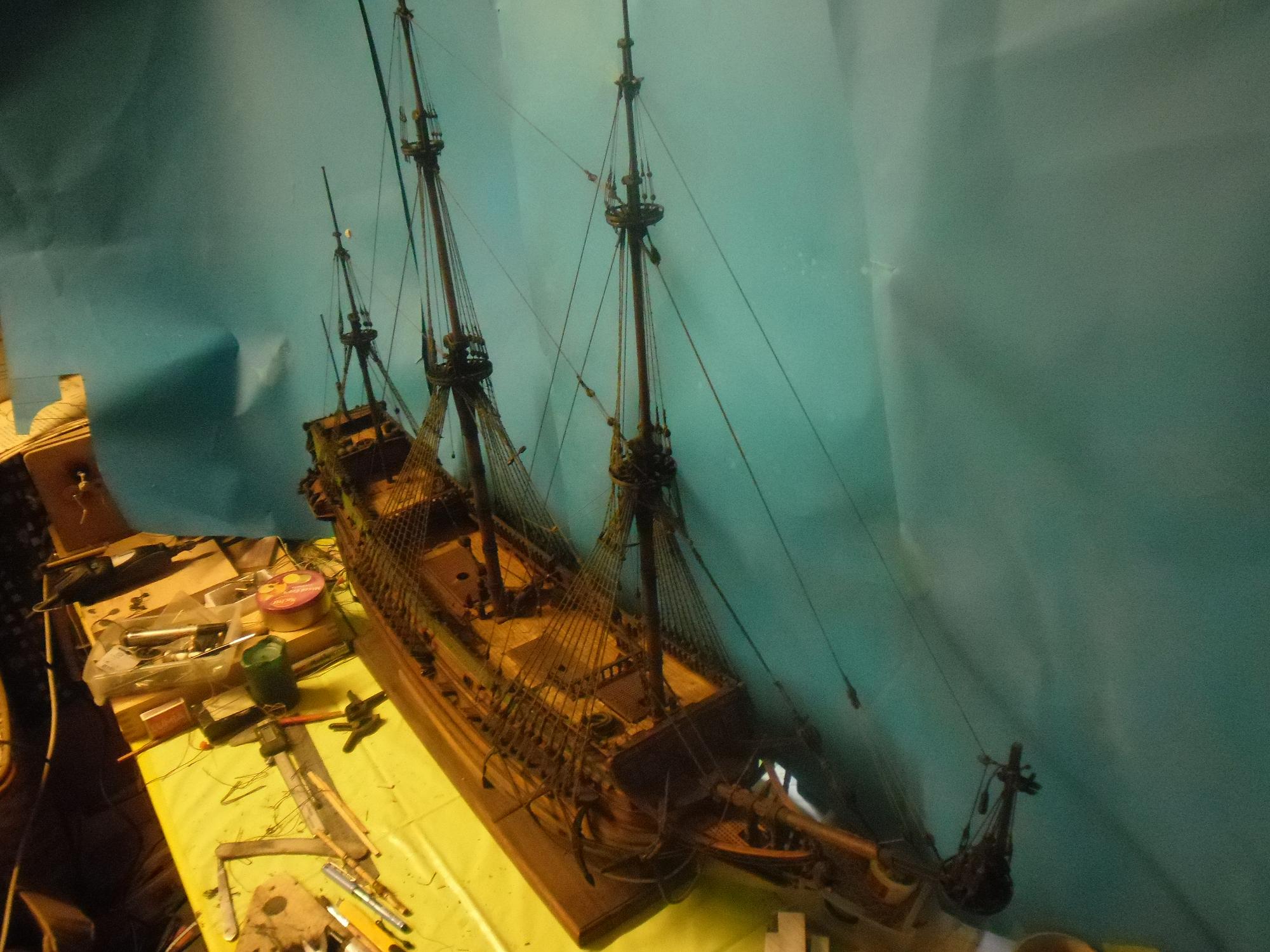 Środek wyłożyłem niebowym kartonem aby było można dobrze focić . Zamykana będzie ta szopa płytą na uszczelkach . Zdejmowana będzie jak będę dokładał elementy . No i nie będzie możliwości uszkodzenia modelu . Ostatnio jak wiązałem linki poprosiłem Monikę o przyświecenie latarka to od razu ułamała maszt .