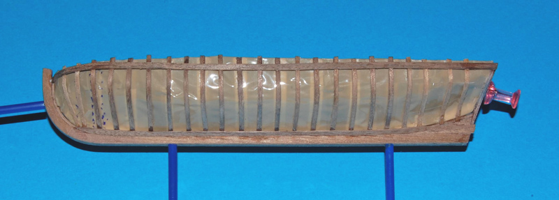 Wkleiłem pozostałe (ukształtowane) wręgi, następnie wyciąłem listwy szer. ok. 2 mm na krawędź szalupy, żeby spięły wręgi