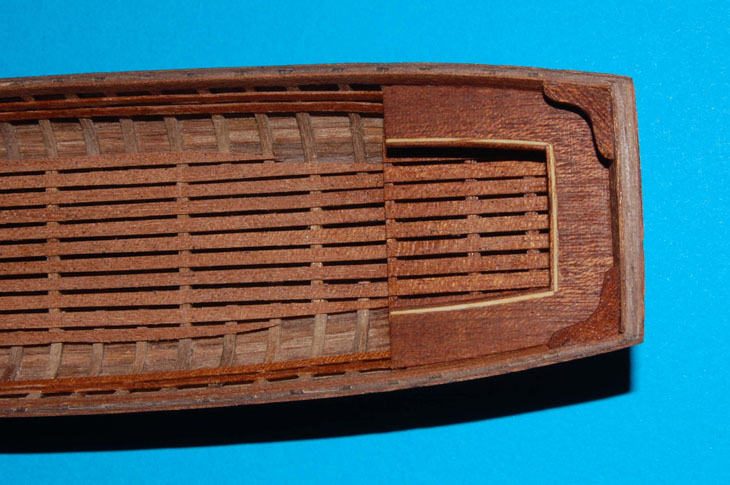 Kolejne elementy to gretingi (listwy z meranti o szer. 2 mm), "główny" i "rufowy" (sternika). Tak jak poprzednio najpierw zrobiłem szablony i wg nich wyciąłem gretingi. Niestety nie obyło się bez błędu, który wyszedł po zrobieniu gretingu rufowego. Wynikło to z tego, że przesunąłem ostatnią ławkę wioślarzy do tyłu* (tym samym skróciłem greting rufowy) i uwidoczniły się zakończenia listew gretingu głównego.