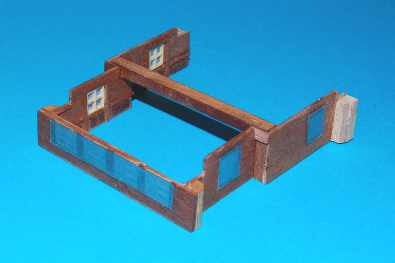 Ścianki są z obłogu (1 mm) meranti, okna (ok. 7 x 7 mm) wykonałem z forniru jesionu z dwoma, trzema i czterema szprosami (sposób wykonania okien jest w relacji, więc nie powtarzam :) ).