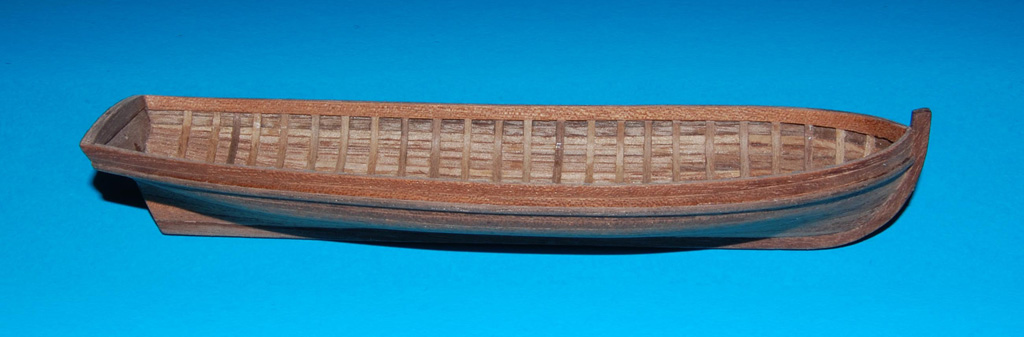 Wyrównałem krawędzie burt i nakleiłem listwy odbojowe (uformowane do kształtu na parze). Wewnątrz między wręgi wkleiłem kawałki listew (trochę dłubaniny ). Końcówki wręgów ścieniłem, żeby już nie pogrubiać krawędzi burt. Na to zostanie naklejona listwa mahoniowa, wykończeniowa.