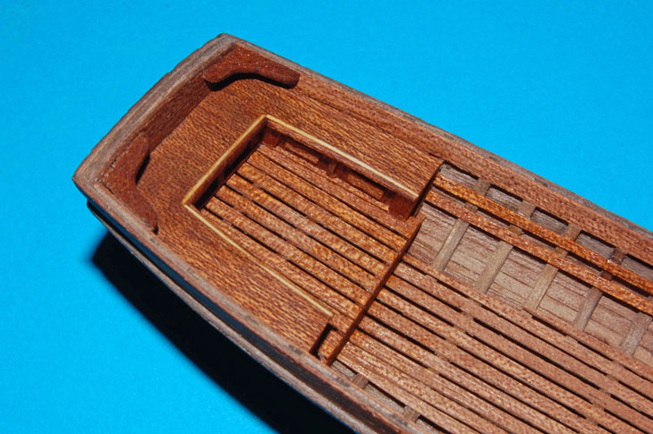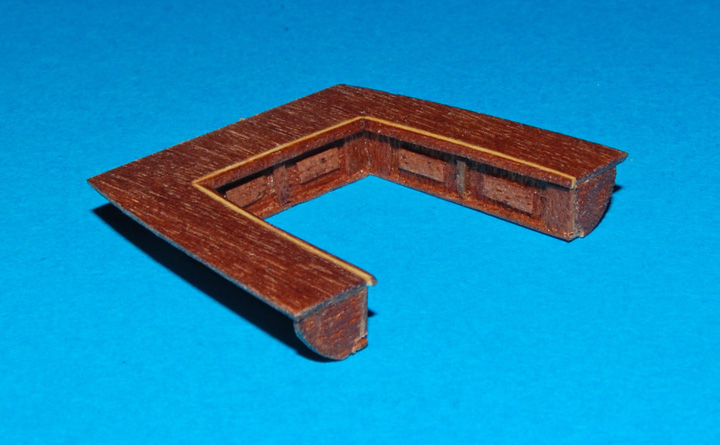 Listwy wewnętrzne (mahoń sapeli) wyciąłem wg kształtu zewnętrznych tylko z naddatkiem (szersze) i wkleiłem wykończając wewnętrzne krawędzie burt. Naddatek po wyschnięciu ściąłem i wyszlifowałem wyrównując z krawędzią. Nakleiłem też szerszy pasek forniru na stępkę (to w poprzednim poście).