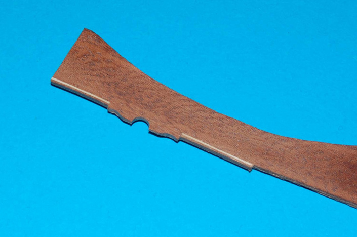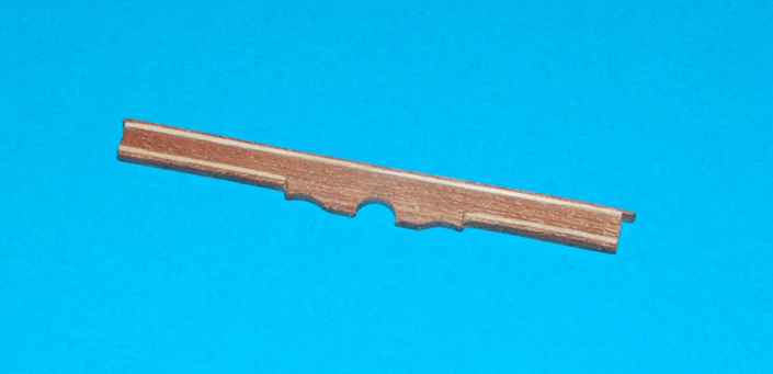 Tak jak poprzednio, skleiłem trzy warstwy forniru (sklejka) i wyciąłem parapet na wykończenie burty (jako jeden element szer. 3 mm). Nawierciłem w parapecie i burcie otwory ø = 0,5 mm na szpilki, którymi będę utrzymywał parapet we właściwym miejscu w czasie klejenia.