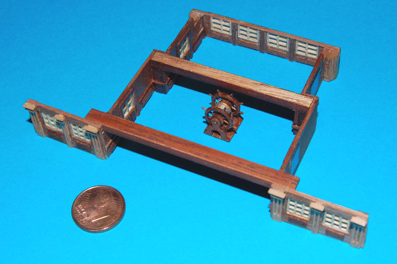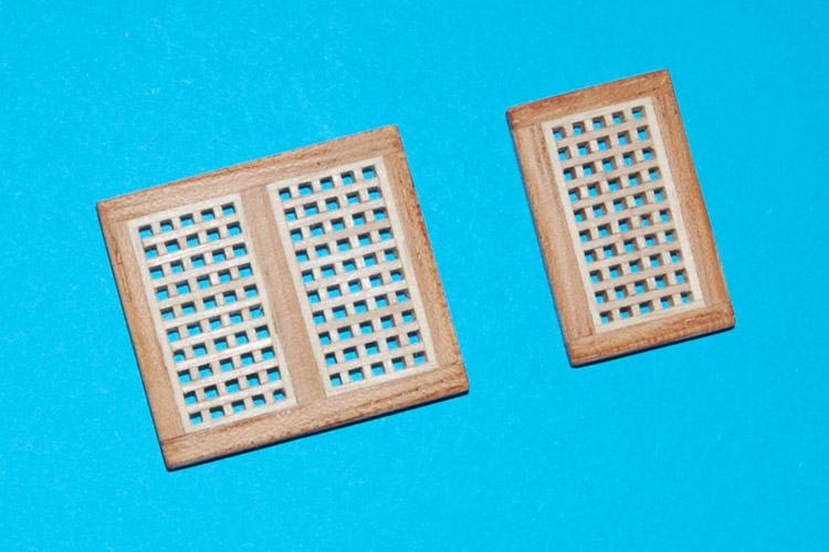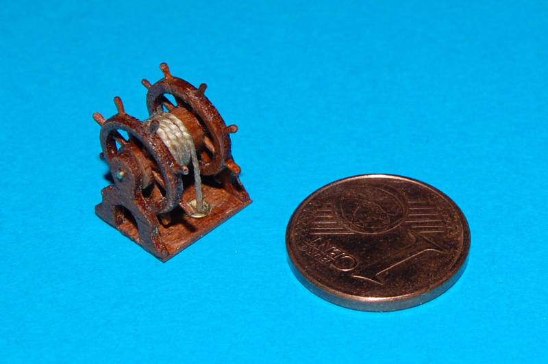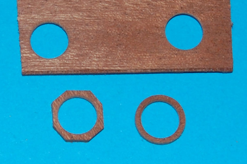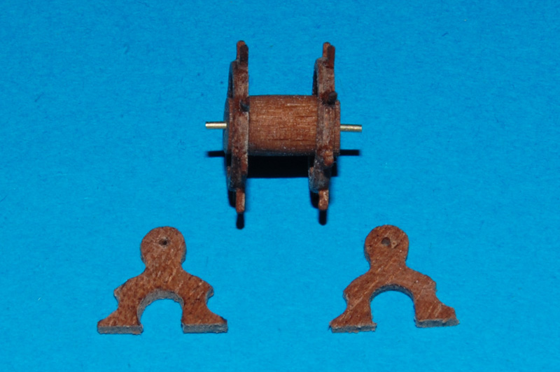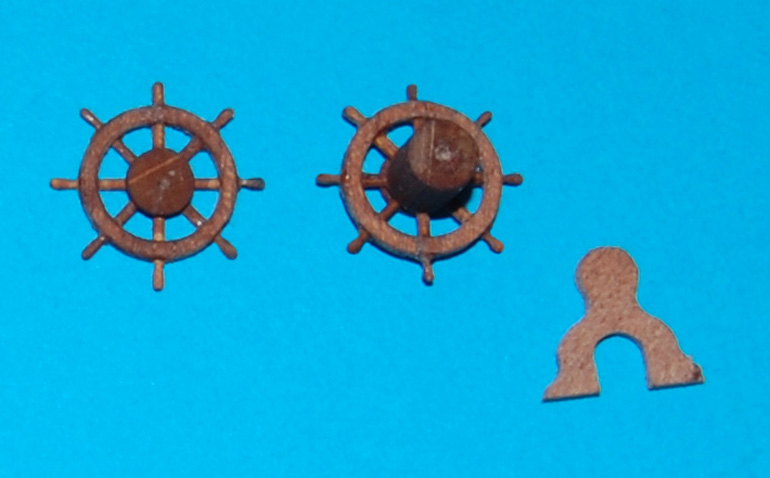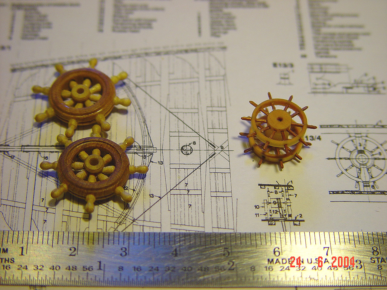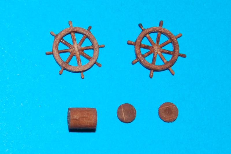Podwójne koło sterowePrzed kołami właściwymi zrobiłem dwa prototypy z ośmioma szprychami. Z podwójnego forniru meranti (sklejki) wykonałem obręcze ø= 8,5 mm (wewnątrz ø= 7 i 7,5 mm), następnie w połowie obręczy zrobiłem nacięcie (bardzo delikatnie) do połowy i wkleiłem na CA szprychę ø= 0,5 mm z drewna