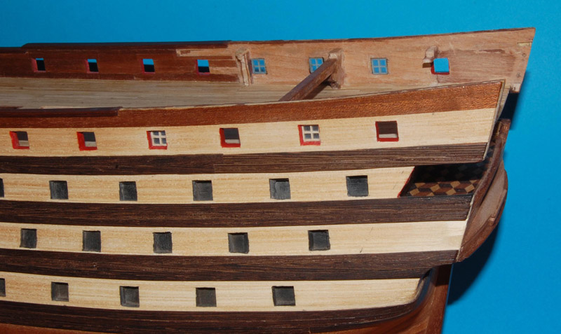 Kilka miesięcy temu, przy robieniu okien na burcie rufy, miałem obiekcję co do usuwania pokładnika, ale teraz go usunąłem wraz z kawałkiem wręgi i wyciąłem te brakujące otwory. Bo jak nie teraz, to już nie będzie kiedy, bo więcej przeróbek nie planuję.