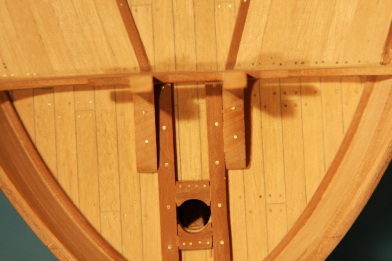 Zabierając się do dziobu absolutnie nie mogłem dogadać się z planami zestawowymi.Delikatnie mówiąc to co zaproponowała firma nijak się miało do ówczesnych konstrukcji.Dlatego postanowiłem nieco zmodyfikować zestaw.Niestety tym razem "nieco" wiązało się z większą demolką już wykonanych elementów.Uprzedzając słowa krytyki prosiłbym o wyrozumiałość.Modyfikacje odbywały się nie w oparciu o plany a jedynie o zdjęcia znalezione w intertnecie.Co oznacza,że nie muszą być całkowicie zgodne z rzeczywistością a są jedynie moją wolną twórczością artystyczną.Niestety nic lepszego nie byłem w stanie wymyślić.Do zakończenia przygody z dziobem brakuje jeszcze mocowania masztu do belek biegnących od stewy dziobowej.Ale to dopiero po ustawieniu masztu.