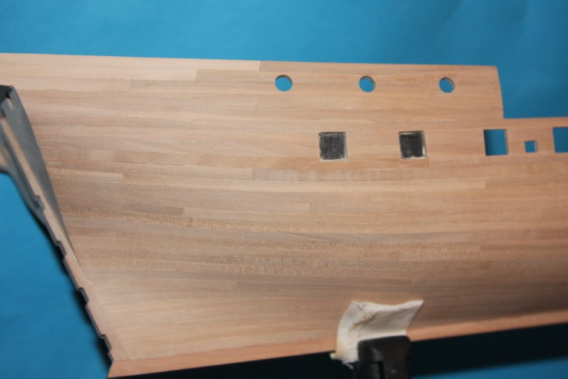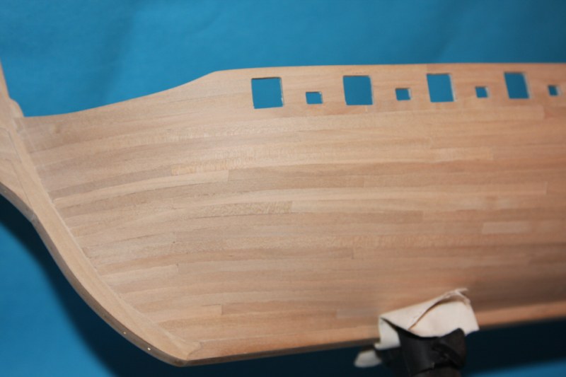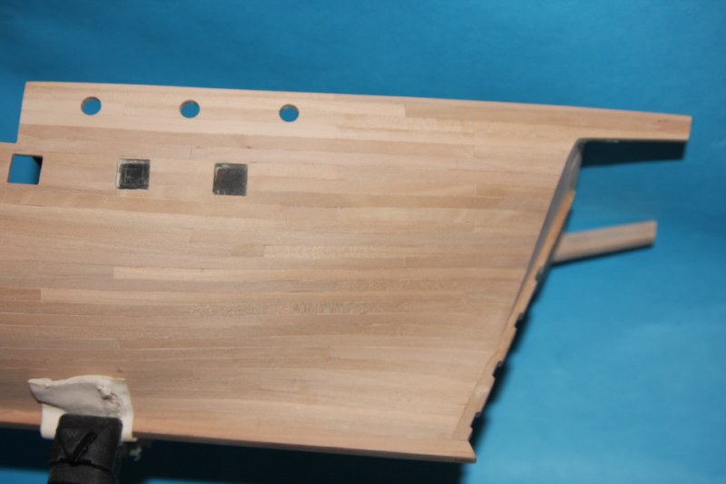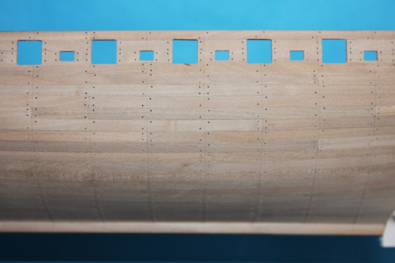 Pracowite zatykanie uprzednio wywierconych dziurek w poszyciu prawie zakończone.Pozostały jeszcz listwy nadburcia górnego pokładu.Postanowiłem trochę poeksperymentować.Ponieważ nadburcie górnego pokładu,odbojnice i poręcze chcę pomalować na czarno,resztę dziurek pozatykam dopiero po malowaniu.Zobaczymy co z tego wyjdzie (podpatrując modele Baranowa-wyglądało to świetnie).