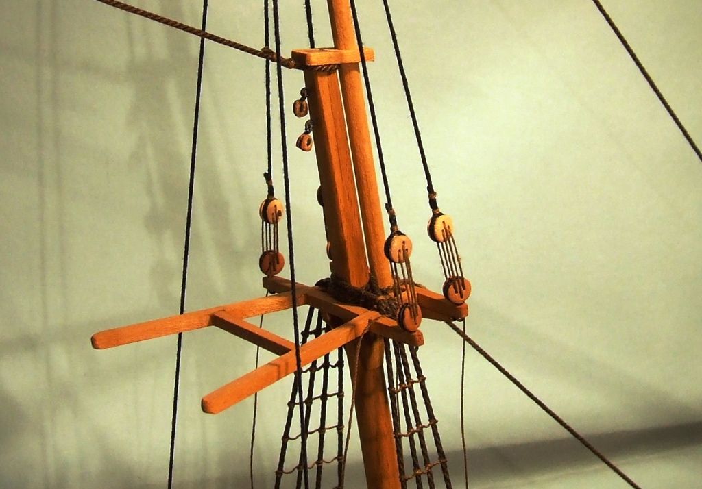 Teraz zamontuję potrzebne bloczki do rei i drzewców gafli.