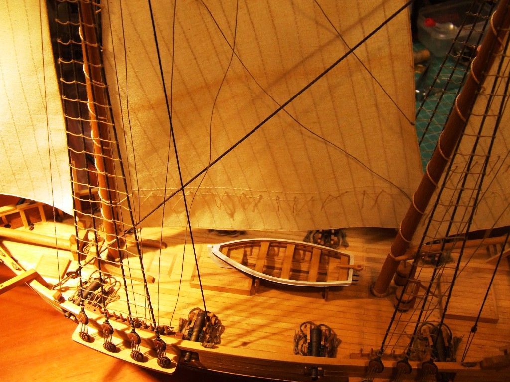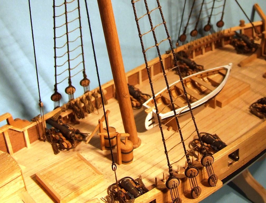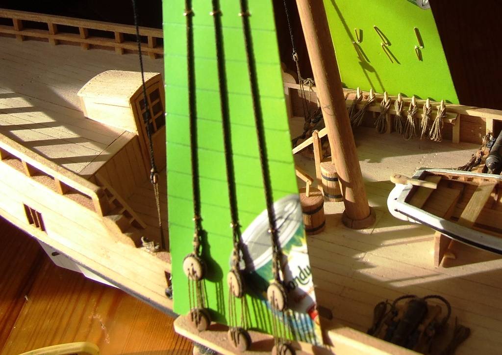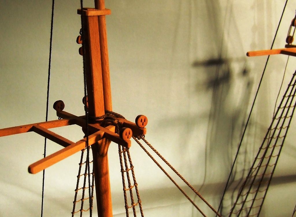 Teraz zamontuję potrzebne bloczki do rei i drzewców gafli.