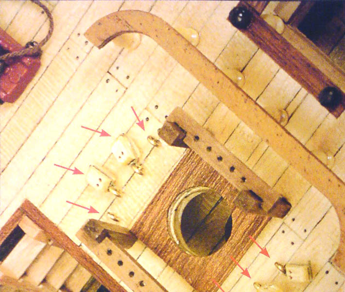 Zrobiłeś sobie wyciąganą ta półokrągłą poręcz za belką z naglami za grotem ??? Jeśli nie to ciekawe jak tam cokolwiek przywiążesz - zbuchtujesz. Ja ogólnie wszystkie tralki wstawiłem na gwoździk 1 mm. Można okręt cały za nie powiesić i nie ma problemu z tym że przy jakiś innych pracach się trąci przyklejone do pokładu na styk i się odłamie , a te co mogą przeszkadzać to zostawiłem demontowalne na gwożdzikach wciśniętych w pokład. Ławy wantowe też do ostatniego momentu wklejenia wszystkich jufersów poczyniłem wyciągane posadowione na kilku gwoździkach bo łatwiej się mocuje i obrabia w rękach niż na modelu. Takie drobne uwagi taktyczne ułatwiające życie.