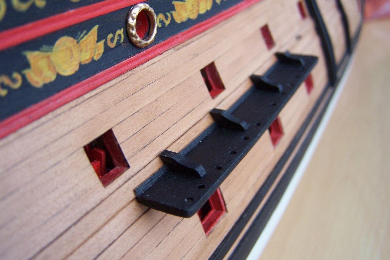 Cześć.Przybyło trochę drobiazgów.Skończyłem zdobienia na rufie.Zamocowałem ostatnie lawety jeszcze bez armat, a na koniec schodki na burtach.Jednym słowem nuda :lol: