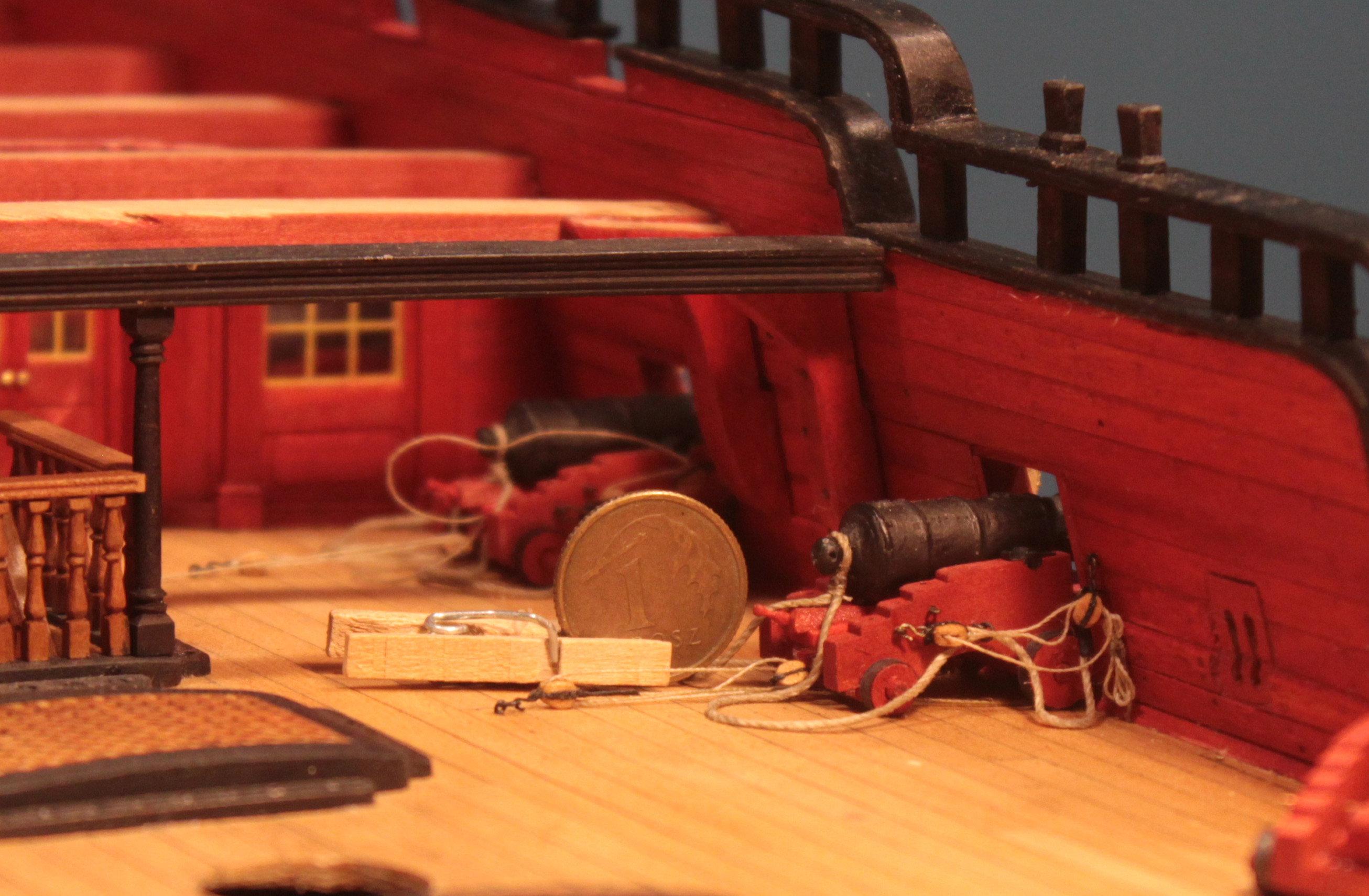 Zamocowałem na gotowo cztery lawety z działami umieszczone przed ścianką działową. Pomimo że działa będą przykryte ćwierć pokładem rufowym, to ich talie będą widoczne. Działo na lawecie jest porównywalne z jednogroszówką, a są to 18 funtowe armaty.