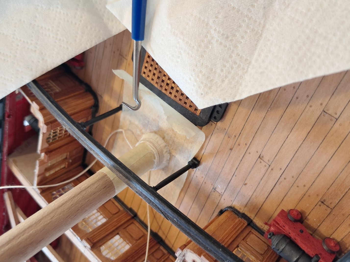 Dziś uporałem się z ostatnimi kółkami lawet do dział 18- funtowych. Lawet jest 22 sztuki. Najlepszych 16 sztuk będzie zrobione bez uproszczeń. Pozostałe przykryje pokład rufowy.